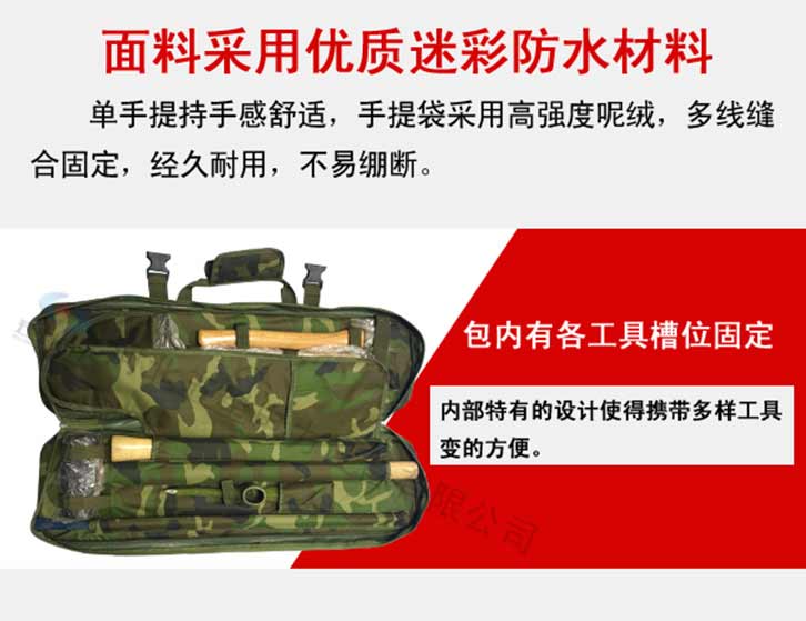 防汛組合工具包六件套:鍬、鎬、消防斧、十磅錘、鋸、撬棍、兩節(jié)連接桿、工具包。一柄多用,適用于消防隊員使用