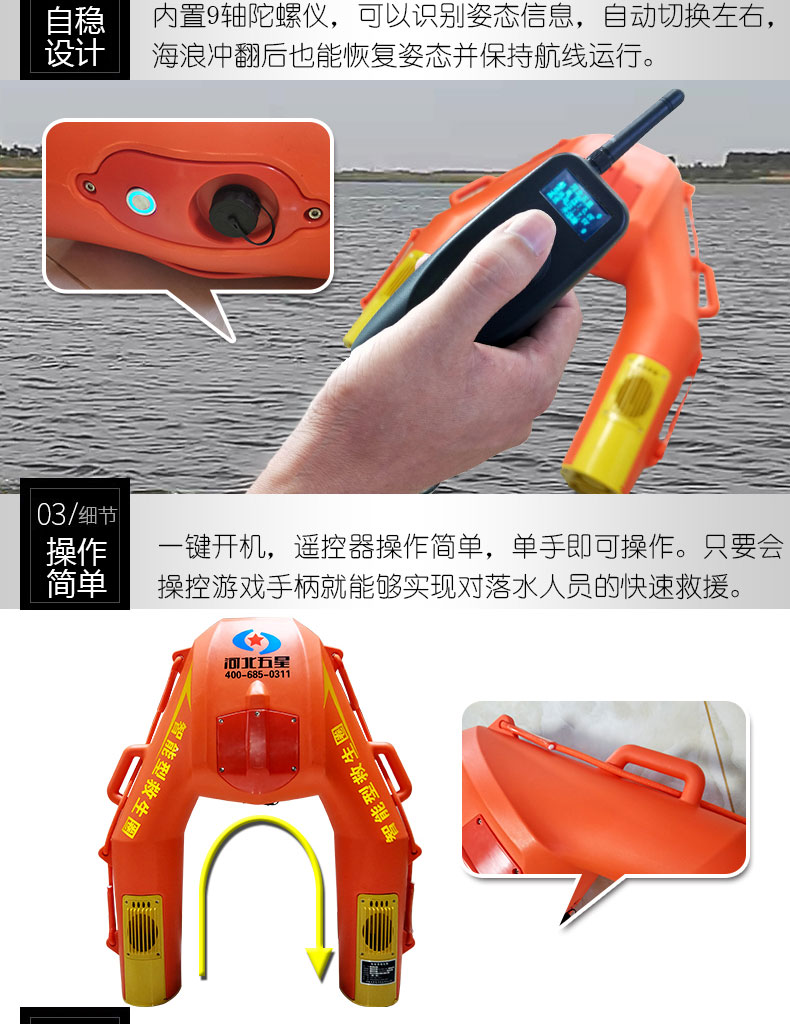 智能遙控救生器,外殼采用耐磨性、電絕緣性、韌性及耐寒性好的HDPE材料制作,適應(yīng)各種不同惡劣環(huán)境,目前搭配的動(dòng)力系統(tǒng)是安全性很好的鋰電池集成系統(tǒng),使用安全,內(nèi)置9軸陀螺儀,可以識(shí)別姿態(tài)信息,自動(dòng)切換左右,海浪沖翻后也能恢復(fù)姿態(tài)并保持航線運(yùn)行。