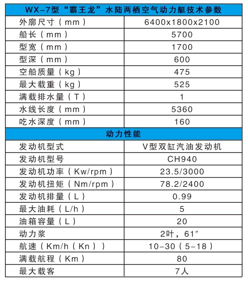 河北五星“霸王龍”水陸兩棲空氣動力艇是一種運(yùn)用空氣動力學(xué)、采用航空發(fā)動機(jī)和空氣螺旋槳推動,通過置于船體上部的大功率內(nèi)燃機(jī)帶動碳纖維螺旋槳產(chǎn)生空氣動力的多地形交通工具。所搭載的航空發(fā)動機(jī)動力系統(tǒng)強(qiáng)勁,功率可達(dá)300馬力以上,螺旋槳推力可達(dá)500公斤以上,操縱機(jī)動靈活,靜水巡航速度可達(dá)40km/h,可以高時(shí)速可達(dá)70km--120km/h。