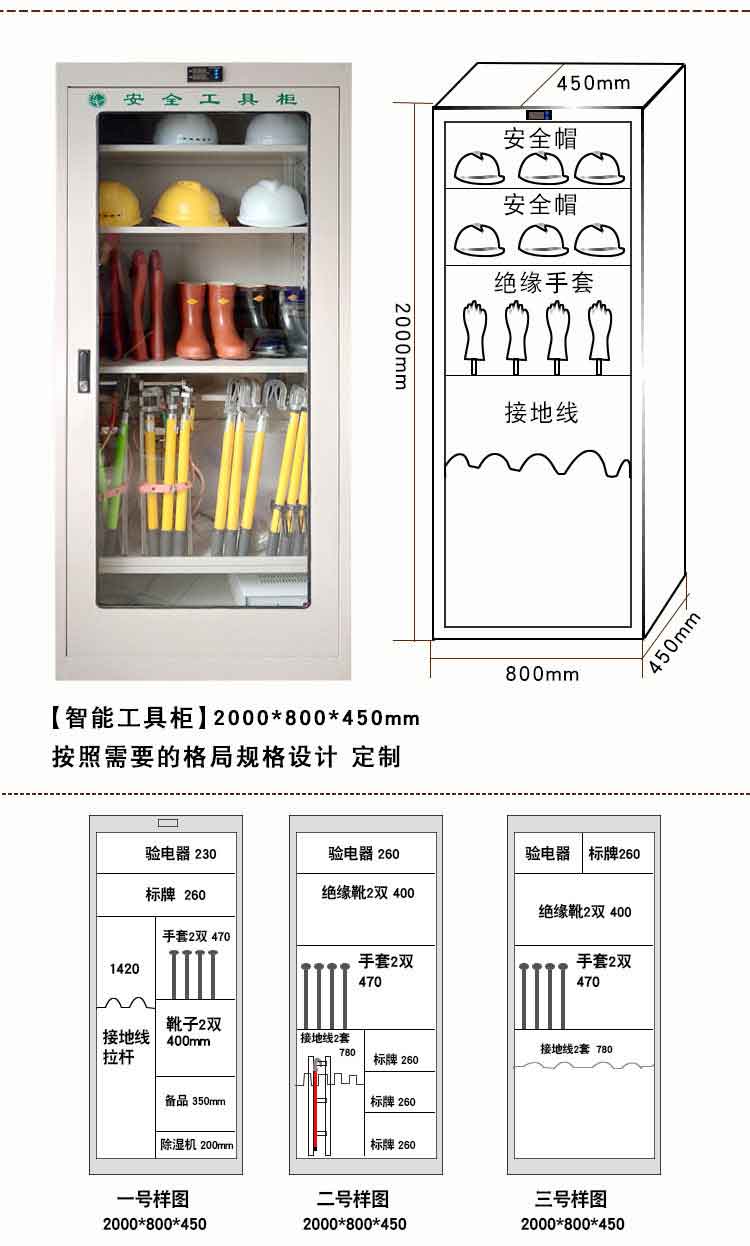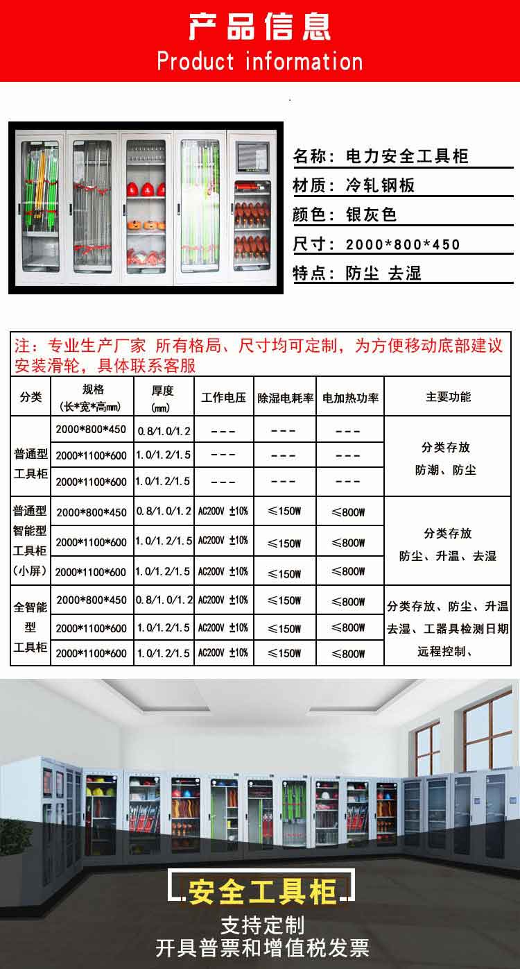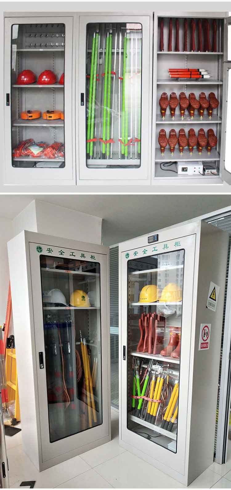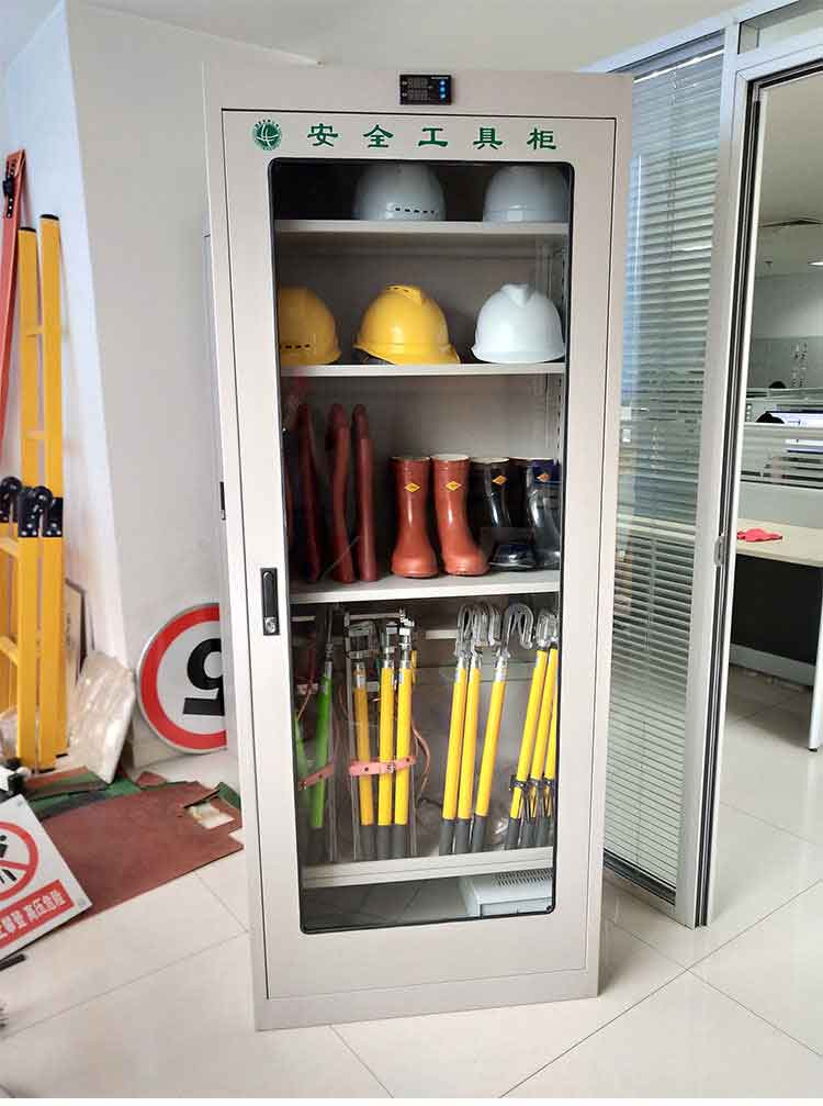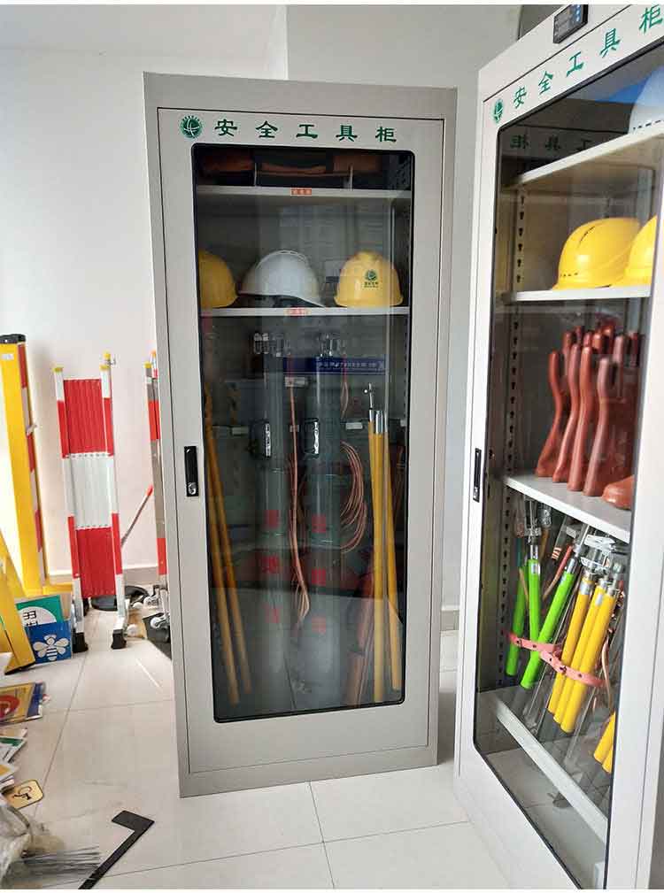 電力安全工具柜又稱安全工器具柜,按功能可以分為普通排風除濕柜,智能烘干除濕柜,智能抽濕除濕柜等 外殼選用1.2優質冷板,采用磷化鋅系、藝術型靜電噴涂,高強度鋼化透明玻璃(外觀色為微機灰)。接地線均配有接地線繞線架及帶夾反光編號牌,使接地線纏繞規范不易損壞,擺放整齊使用方便;絕緣手套配有防粘連撐板,絕緣擋板、絕緣棒、驗電筆、操作桿均設有橡膠墊定位卡,安全帶、腳扣、鑰匙設有專用掛鉤,標示牌按種類分格放置,圍網配有專用包,網桿配有專用筒,網桿座分格放置,防毒面具配有專用箱,呼吸器設有專用滑板。廣泛應用于各種電壓等級的變電站、集控站、線路工區以及電力公司客服中心等單位和部門,并適應不同溫濕度地區的使用。