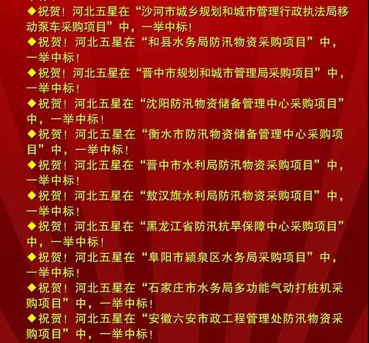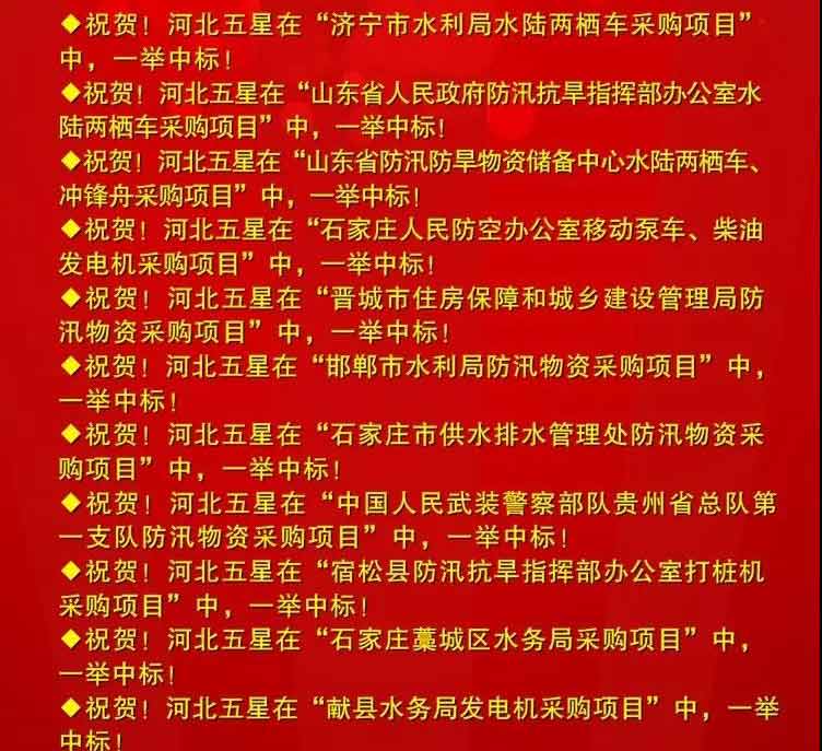 河北五星電力設(shè)備有限公司是我國防汛抗旱、搶險(xiǎn)救災(zāi)、應(yīng)急減災(zāi)救援和電力設(shè)備及安全工器具、市政設(shè)施、地下管網(wǎng)行業(yè)中,集科研、開發(fā)、生產(chǎn)、銷售及服務(wù)于一體的現(xiàn)代化技術(shù)裝備高新技術(shù)企業(yè)。我公司多次中標(biāo)項(xiàng)目,榮譽(yù)成就屬于過去,河北五星永駐輝煌。